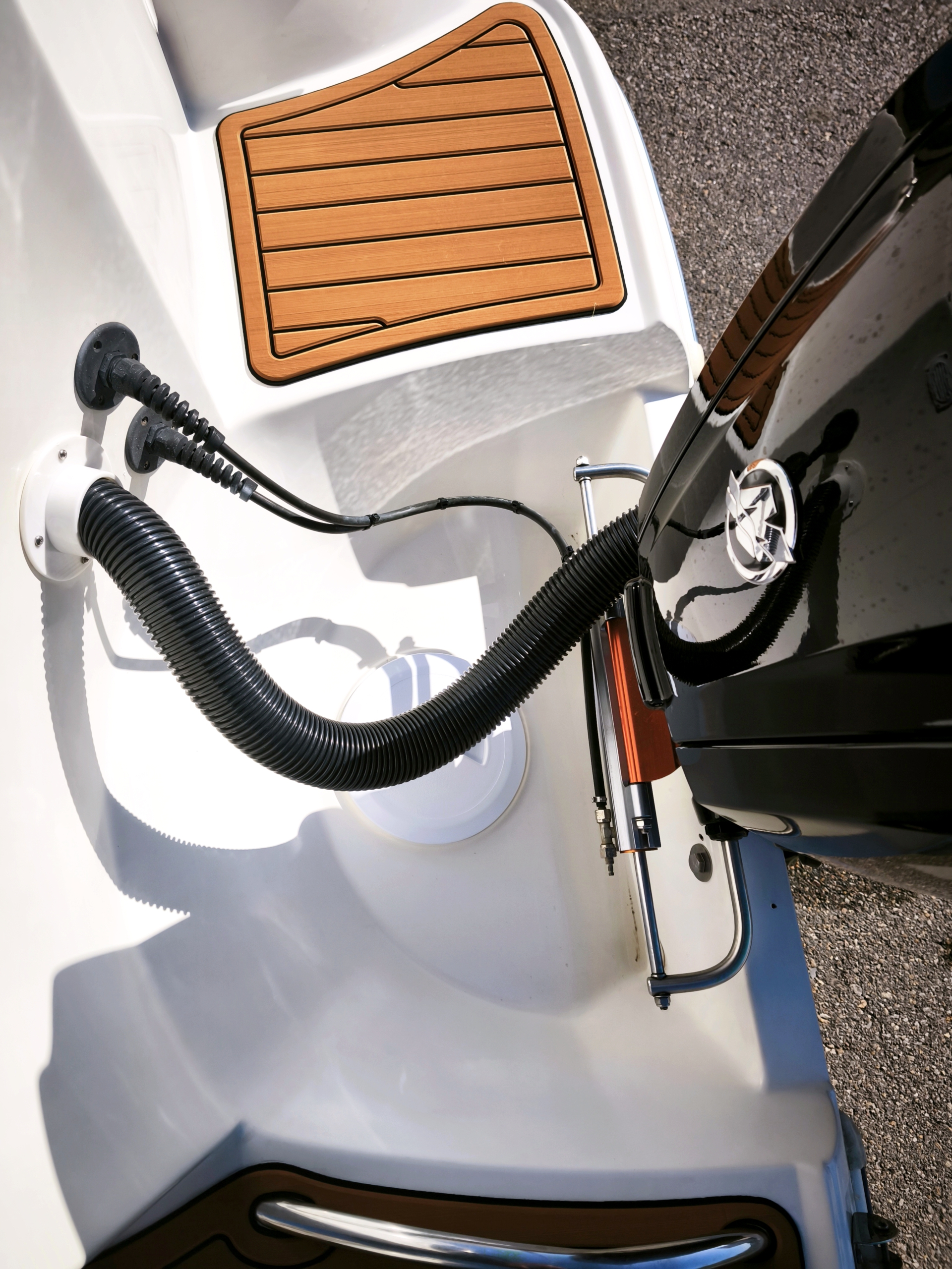 Acceso desde la popa a la bañera prácticamente al ras con ducha en la misma plataforma de popa.